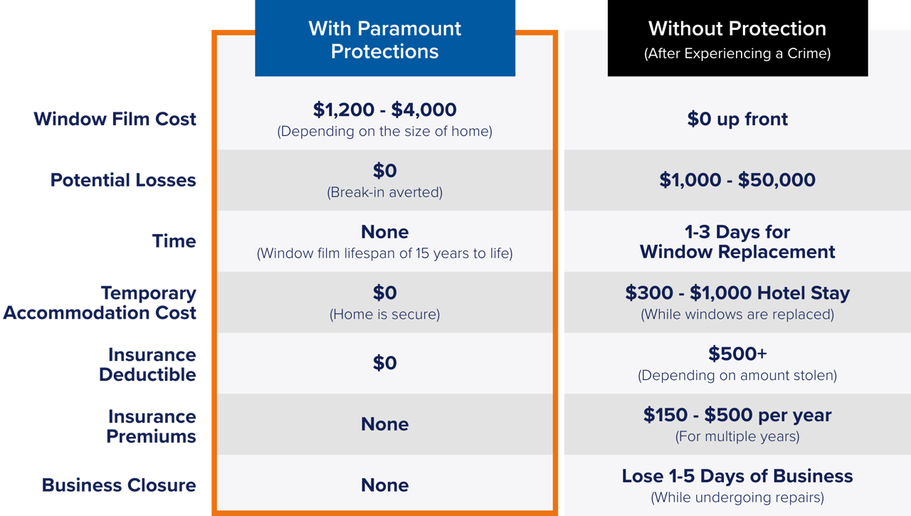 Stop home invaders in their tracks with the protection of Toronto’s most cutting-edge security solutions. Paramount Protections provides complete security systems for homes and businesses across the GTA. From shatter-resistant glass security film and home security systems to car theft prevention and more, our services give you the critical time you need for police to arrive on the scene. Protect your business, your property, and your family with Paramount Protections.